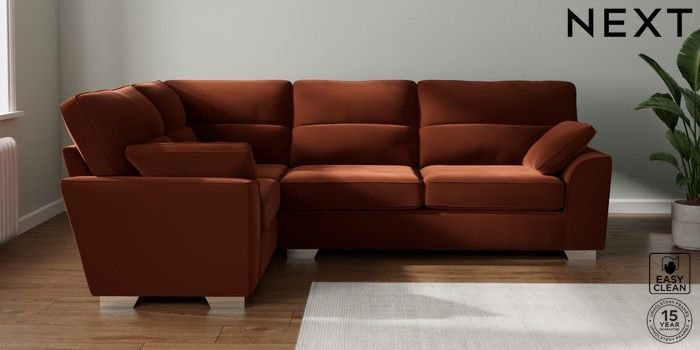 7.3.1 Buy Stamford Highback Large Corner Sofa - Left Hand Plush Velvet Easy Clean Ginger Orange Large Square Angle - Chrome Metal from the Seasons online shop Click here to use our website with more accessibility support, for example screen readers