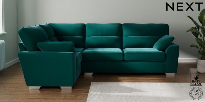 7.3.1 Buy Stamford Highback Large Corner Sofa - Left Hand Plush Velvet Easy Clean Juniper Green Large Square Angle - Chrome Metal from the Seasons online shop Click here to use our website with more accessibility support, for example screen readers