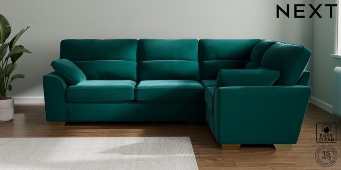 7.3.1 Buy Stamford Highback Large Corner Sofa - Right Hand Plush Velvet Easy Clean Juniper Green Large Square Angle - Brushed Brass from the Seasons online shop Click here to use our website with more accessibility support, for example screen readers