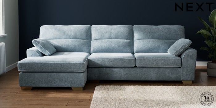 7.2.10 Buy Stamford Highback Large Sofa Chaise - Left Hand Plush Chenille Light Blue Large Square Angle - Brushed Brass from the Seasons online shop Click here to use our website with more accessibility support, for example screen readers
