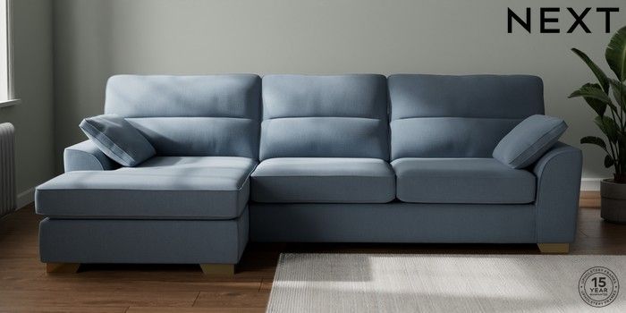 7.3.1 Buy Stamford Highback Large Sofa Chaise - Left Hand Relaxed Linen Look Mid Blue Large Square Angle - Brushed Brass from the Seasons online shop Click here to use our website with more accessibility support, for example screen readers