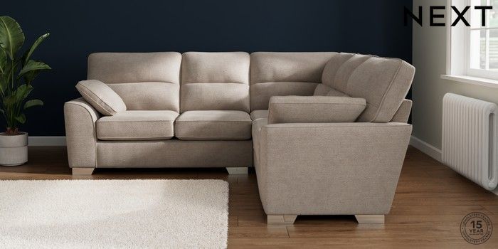 7.2.10 Buy Stamford Highback Medium Corner Sofa - Universal Boucle Chenille Light Natural Large Square Angle - Chrome Metal from the Seasons online shop Click here to use our website with more accessibility support, for example screen readers