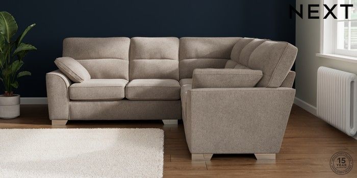 7.2.10 Buy Stamford Highback Medium Corner Sofa - Universal Chunky Chenille Light Dove Large Square Angle - Chrome Metal from the Seasons online shop Click here to use our website with more accessibility support, for example screen readers