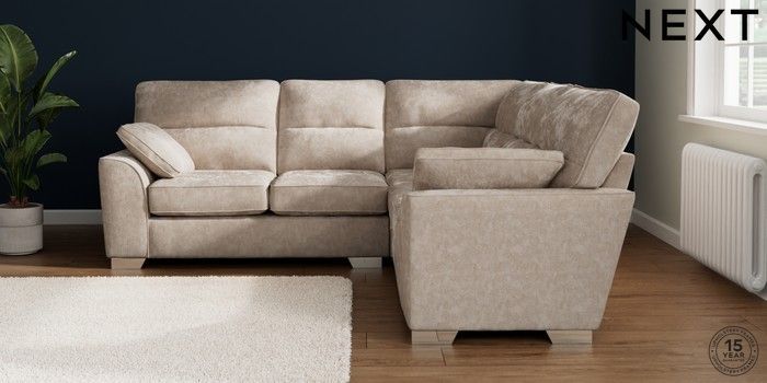 7.2.10 Buy Stamford Highback Medium Corner Sofa - Universal Distressed Velour Mid Natural Large Square Angle - Chrome Metal from the Seasons online shop Click here to use our website with more accessibility support, for example screen readers