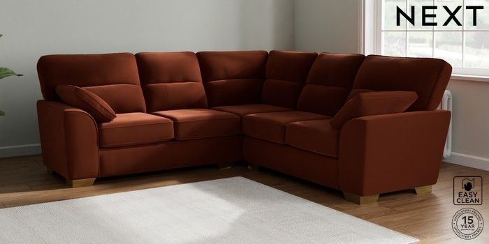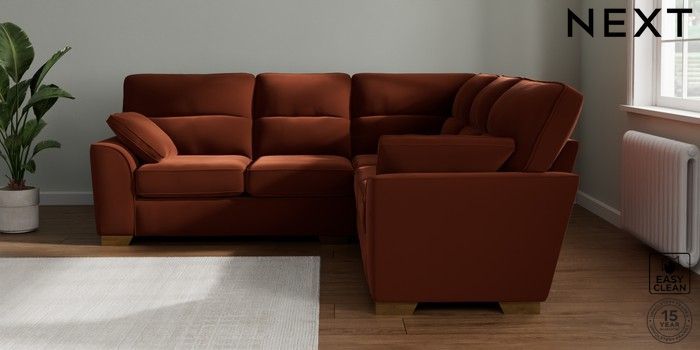 7.2.10 Buy Stamford Highback Medium Corner Sofa - Universal Plush Velvet Easy Clean Ginger Orange Large Square Angle - Brushed Brass from the Seasons online shop Click here to use our website with more accessibility support, for example screen readers