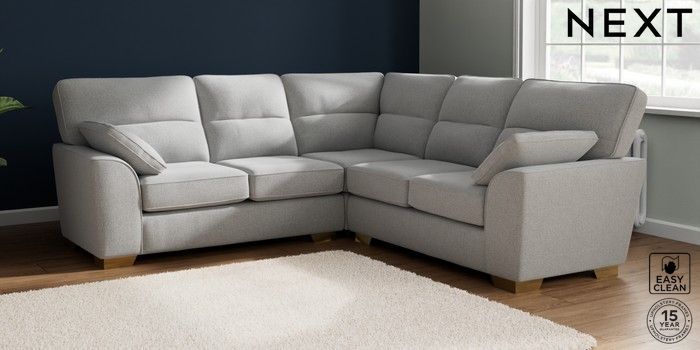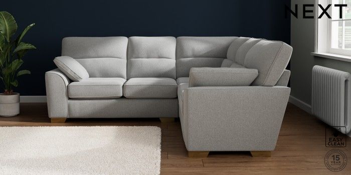 7.2.10 Buy Stamford Highback Medium Corner Sofa - Universal Tweedy Blend Easy Clean Light Silver Grey Large Square Angle - Brushed Brass from the Seasons online shop Click here to use our website with more accessibility support, for example screen readers