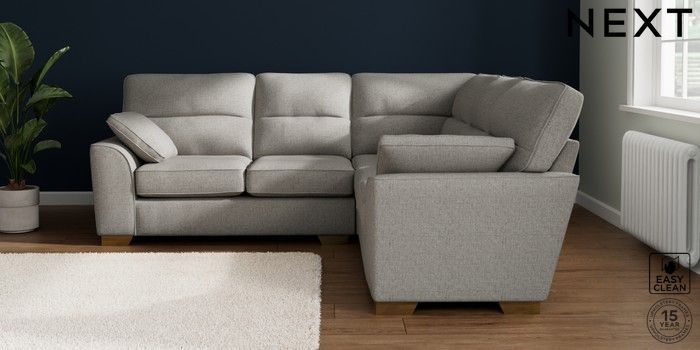 7.2.10 Buy Stamford Highback Medium Corner Sofa - Universal Woven Chenille Easy Clean Light Grey Large Square Angle - Brushed Brass from the Seasons online shop Click here to use our website with more accessibility support, for example screen readers