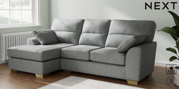 7.2.10 Buy Stamford Highback Medium Sofa Chaise - Left Hand Chunky Boucle Easy Clean Mid Grey Large Square Angle - Brushed Brass from the Seasons online shop Click here to use our website with more accessibility support, for example screen readers