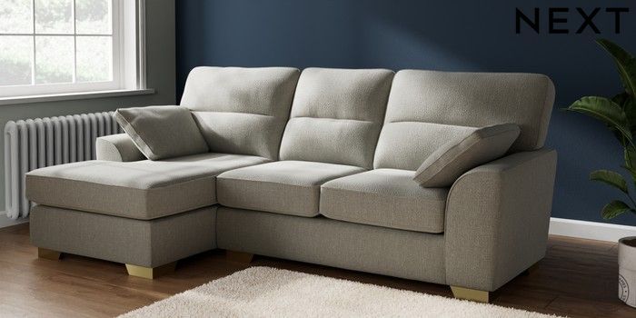 7.2.10 Buy Stamford Highback Medium Sofa Chaise - Left Hand Chunky Texture Dove Large Square Angle - Brushed Brass from the Seasons online shop Click here to use our website with more accessibility support, for example screen readers