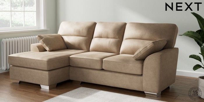 7.2.10 Buy Stamford Highback Medium Sofa Chaise - Left Hand Luxe Chenille Mid Camel Beige Large Square Angle - Chrome Metal from the Seasons online shop Click here to use our website with more accessibility support, for example screen readers