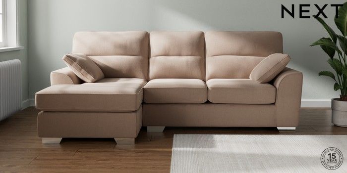 7.3.1 Buy Stamford Highback Medium Sofa Chaise - Left Hand Relaxed Linen Look Mid Natural Large Square Angle - Chrome Metal from the Seasons online shop Click here to use our website with more accessibility support, for example screen readers