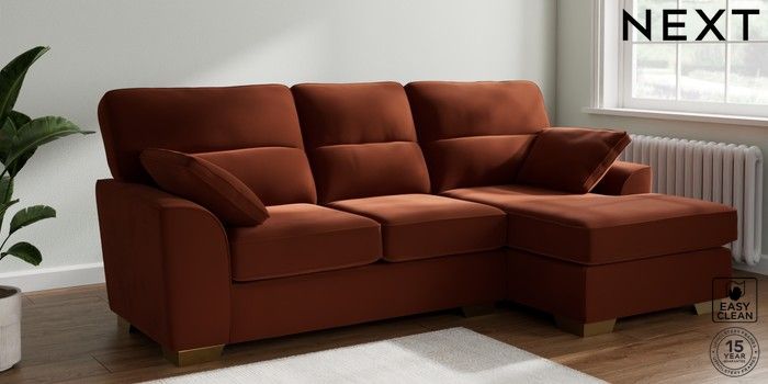 7.3.1 Buy Stamford Highback Medium Sofa Chaise - Right Hand Plush Velvet Easy Clean Ginger Orange Large Square Angle - Brushed Brass from the Seasons online shop Click here to use our website with more accessibility support, for example screen readers