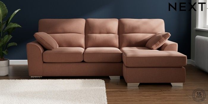 7.2.10 Buy Stamford Highback Medium Sofa Chaise - Right Hand Relaxed Linen Look Light Rust Brown Large Square Angle - Chrome Metal from the Seasons online shop Click here to use our website with more accessibility support, for example screen readers