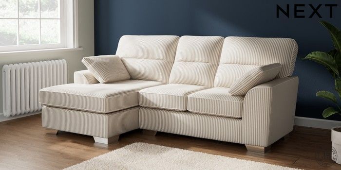 7.3.1 Buy Stamford Highback Small Sofa Chaise - Left Hand Chenille Stripe Natural Large Square Angle - Chrome Metal from the Seasons online shop Click here to use our website with more accessibility support, for example screen readers