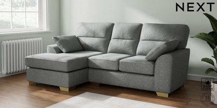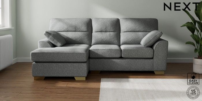 7.2.10 Buy Stamford Highback Small Sofa Chaise - Left Hand Chunky Boucle Easy Clean Mid Grey Large Square Angle - Brushed Brass from the Seasons online shop Click here to use our website with more accessibility support, for example screen readers