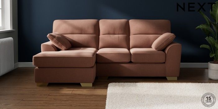 7.2.10 Buy Stamford Highback Small Sofa Chaise - Left Hand Relaxed Linen Look Light Rust Brown Large Square Angle - Brushed Brass from the Seasons online shop Click here to use our website with more accessibility support, for example screen readers