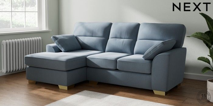 7.3.1 Buy Stamford Highback Small Sofa Chaise - Left Hand Relaxed Linen Look Mid Blue Large Square Angle - Brushed Brass from the Seasons online shop Click here to use our website with more accessibility support, for example screen readers