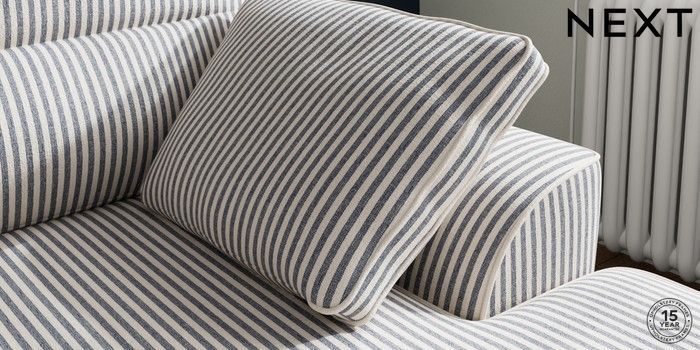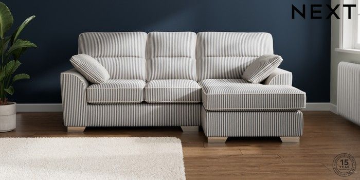 7.3.1 Buy Stamford Highback Small Sofa Chaise - Right Hand Chenille Stripe Slate Blue Large Square Angle - Chrome Metal from the Seasons online shop Click here to use our website with more accessibility support, for example screen readers