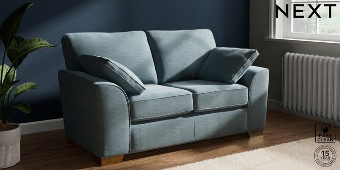 7.2.10 Buy Stamford 2 Seater Small Sofa Fine Chenille Easy Clean Mid Blue Large Square Angle - Brushed Brass from the Seasons online shop Click here to use our website with more accessibility support, for example screen readers