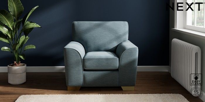 7.3.1 Buy Stamford Armchair Fine Chenille Easy Clean Mid Blue Square Angle - Brushed Brass from the Seasons online shop Click here to use our website with more accessibility support, for example screen readers