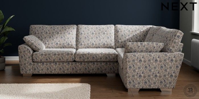 7.3.1 Buy Stamford Large Corner Sofa - Right Hand Relaxed Linen Look Print Woodblock Floral Blue Large Square Angle - Chrome Metal from the Seasons online shop
