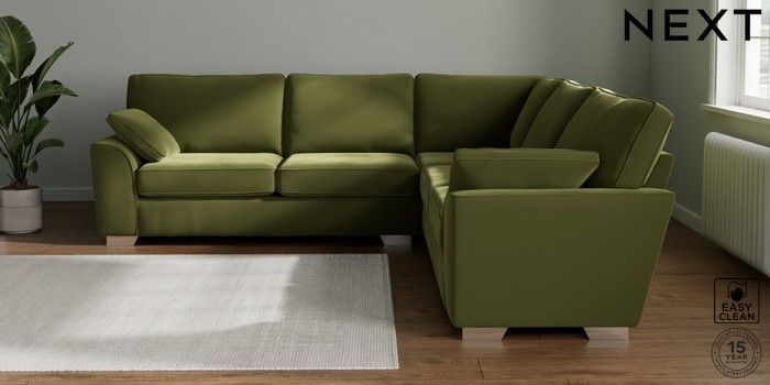 7.3.1 Buy Stamford Large Corner Sofa - Universal Plush Velvet Easy Clean Mid Olive Green Large Square Angle - Chrome Metal from the Seasons online shop Click here to use our website with more accessibility support, for example screen readers