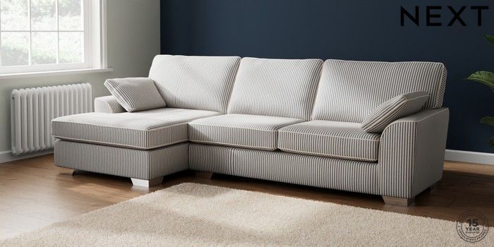 7.3.1 Buy Stamford Large Sofa Chaise - Left Hand Chenille Stripe Slate Blue Large Square Angle - Chrome Metal from the Seasons online shop Click here to use our website with more accessibility support, for example screen readers
