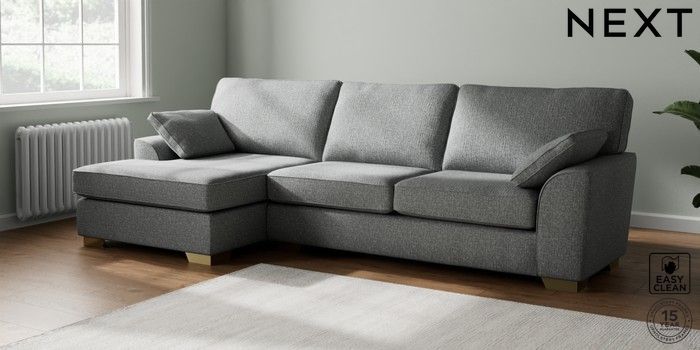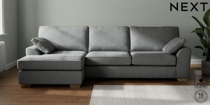 7.2.10 Buy Stamford Large Sofa Chaise - Left Hand Chunky Boucle Easy Clean Mid Grey Large Square Angle - Brushed Brass from the Seasons online shop Click here to use our website with more accessibility support, for example screen readers