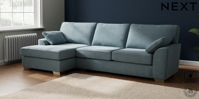 7.2.10 Buy Stamford Large Sofa Chaise - Left Hand Fine Chenille Easy Clean Mid Blue Large Square Angle - Brushed Brass from the Seasons online shop Click here to use our website with more accessibility support, for example screen readers