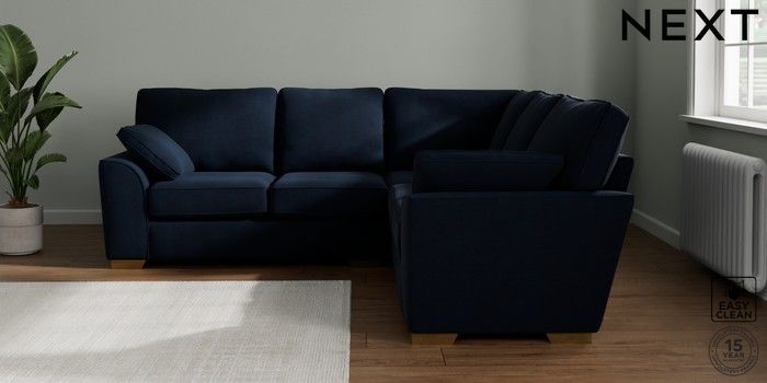 7.2.10 Buy Stamford Medium Corner Sofa - Universal Fine Chenille Easy Clean Dark Navy Blue Large Square Angle - Brushed Brass from the Seasons online shop Click here to use our website with more accessibility support, for example screen readers