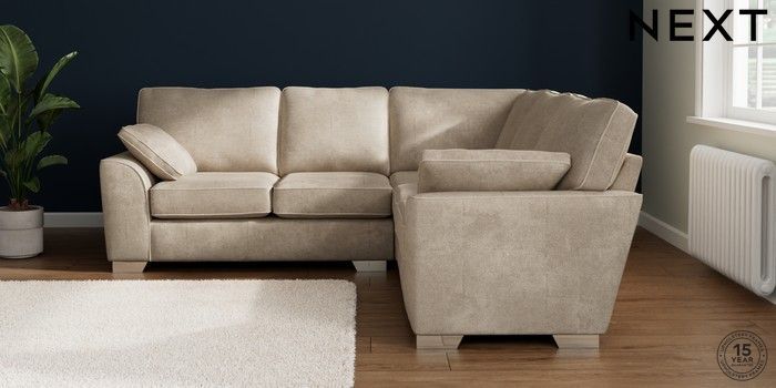 7.2.10 Buy Stamford Medium Corner Sofa - Universal Plush Chenille Light Natural Large Square Angle - Chrome Metal from the Seasons online shop Click here to use our website with more accessibility support, for example screen readers
