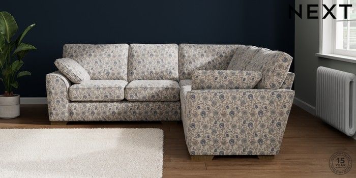 7.3.1 Buy Stamford Medium Corner Sofa - Universal Relaxed Linen Look Print Woodblock Floral Blue Large Square Angle - Mid from the Seasons online shop Click here to use our website with more accessibility support, for example screen readers