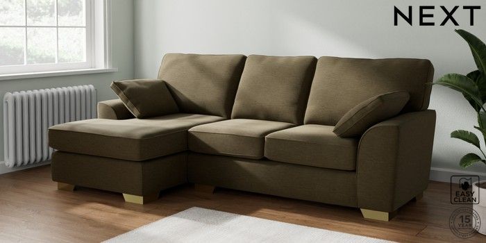 7.2.10 Buy Stamford Medium Sofa Chaise - Left Hand Fine Chenille Easy Clean Dark Moss Green Large Square Angle - Brushed Brass from the Seasons online shop Click here to use our website with more accessibility support, for example screen readers