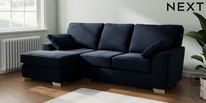 7.2.10 Buy Stamford Medium Sofa Chaise - Left Hand Fine Chenille Easy Clean Dark Navy Blue Large Square Angle - Brushed Brass from the Seasons online shop Click here to use our website with more accessibility support, for example screen readers