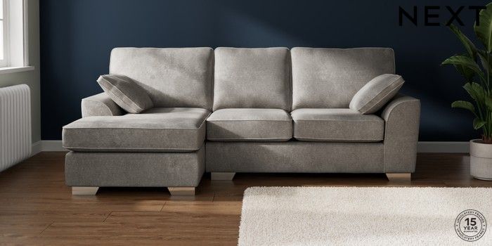 7.2.10 Buy Stamford Medium Sofa Chaise - Left Hand Plush Chenille Light Grey Large Square Angle - Chrome Metal from the Seasons online shop Click here to use our website with more accessibility support, for example screen readers