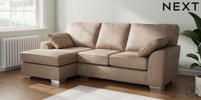7.2.10 Buy Stamford Medium Sofa Chaise - Left Hand Plush Chenille Mid Natural Large Square Angle - Chrome Metal from the Seasons online shop Click here to use our website with more accessibility support, for example screen readers