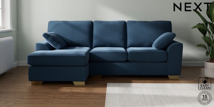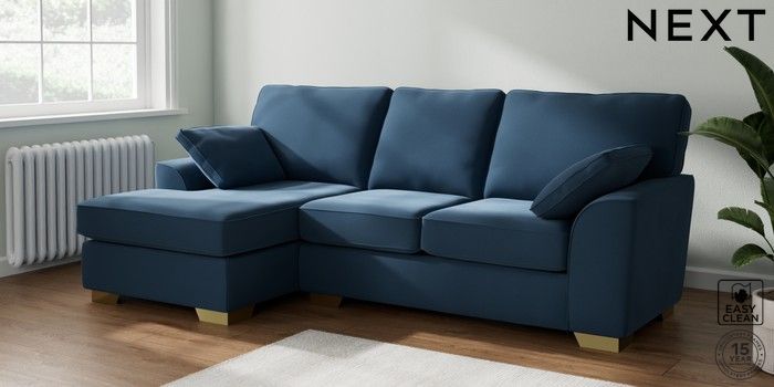 7.3.1 Buy Stamford Medium Sofa Chaise - Left Hand Plush Velvet Easy Clean Airforce Blue Large Square Angle - Brushed Brass from the Seasons online shop Click here to use our website with more accessibility support, for example screen readers