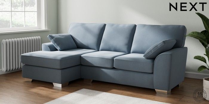 7.3.1 Buy Stamford Medium Sofa Chaise - Left Hand Relaxed Linen Look Mid Blue Large Square Angle - Chrome Metal from the Seasons online shop Click here to use our website with more accessibility support, for example screen readers