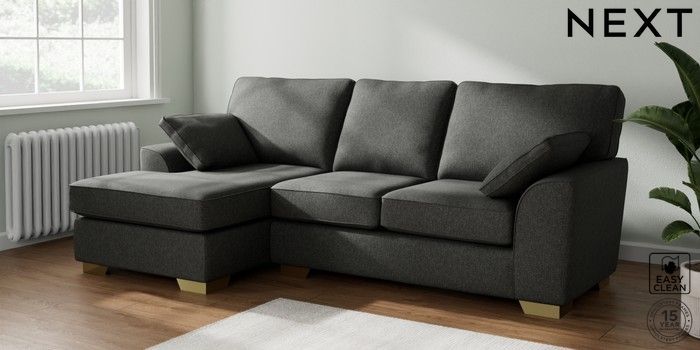 7.3.1 Buy Stamford Medium Sofa Chaise - Left Hand Tweedy Blend Easy Clean Charcoal Grey Large Square Angle - Brushed Brass from the Seasons online shop Click here to use our website with more accessibility support, for example screen readers