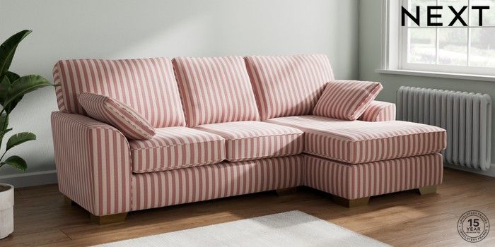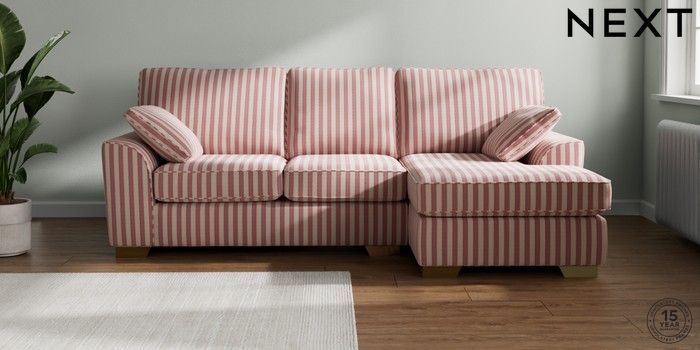 7.3.1 Buy Stamford Medium Sofa Chaise - Right Hand Bold Chenille Stripe Dark Pink Large Square Angle - Brushed Brass from the Seasons online shop Click here to use our website with more accessibility support, for example screen readers
