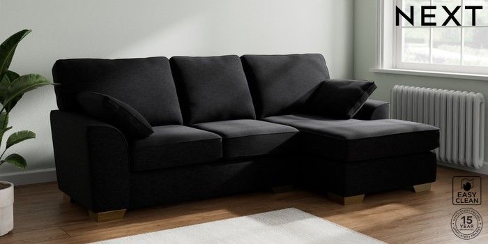7.2.10 Buy Stamford Medium Sofa Chaise - Right Hand Fine Chenille Easy Clean Black Large Square Angle - Brushed Brass from the Seasons online shop Click here to use our website with more accessibility support, for example screen readers