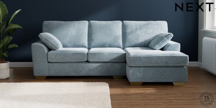 7.2.10 Buy Stamford Medium Sofa Chaise - Right Hand Plush Chenille Light Blue Large Square Angle - Brushed Brass from the Seasons online shop Click here to use our website with more accessibility support, for example screen readers