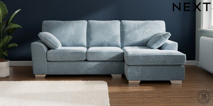 7.2.10 Buy Stamford Medium Sofa Chaise - Right Hand Plush Chenille Light Blue Large Square Angle - Chrome Metal from the Seasons online shop Click here to use our website with more accessibility support, for example screen readers
