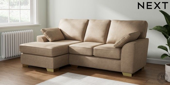 7.2.10 Buy Stamford Small Sofa Chaise - Left Hand Luxe Chenille Mid Camel Beige Large Square Angle - Brushed Brass from the Seasons online shop Click here to use our website with more accessibility support, for example screen readers