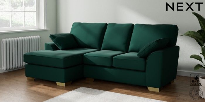 7.3.1 Buy Stamford Small Sofa Chaise - Left Hand Plush Velvet Easy Clean Bottle Green Large Square Angle - Brushed Brass from the Seasons online shop Click here to use our website with more accessibility support, for example screen readers