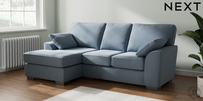 7.3.1 Buy Stamford Small Sofa Chaise - Left Hand Relaxed Linen Look Mid Blue Large Square Angle - Gunmetal from the Seasons online shop Click here to use our website with more accessibility support, for example screen readers