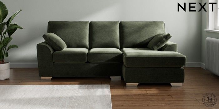 7.3.1 Buy Stamford Small Sofa Chaise - Right Hand Luxe Chenille Mid Green Large Square Angle - Chrome Metal from the Seasons online shop Click here to use our website with more accessibility support, for example screen readers