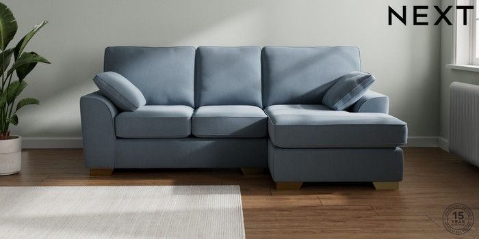 7.3.1 Buy Stamford Small Sofa Chaise - Right Hand Relaxed Linen Look Mid Blue Large Square Angle - Brushed Brass from the Seasons online shop Click here to use our website with more accessibility support, for example screen readers