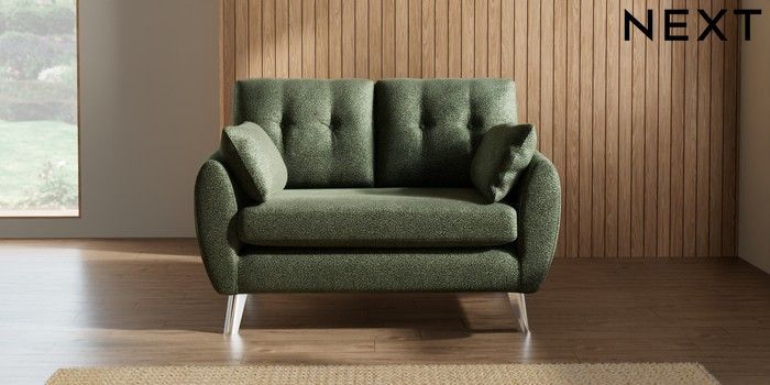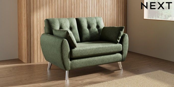 7.3.1 Buy Wilson Buttoned Back 2 Seater Small Sofa Boucle Chenille Dark Moss Green Metal Tapered - Chrome from the Seasons online shop Click here to use our website with more accessibility support, for example screen readers
