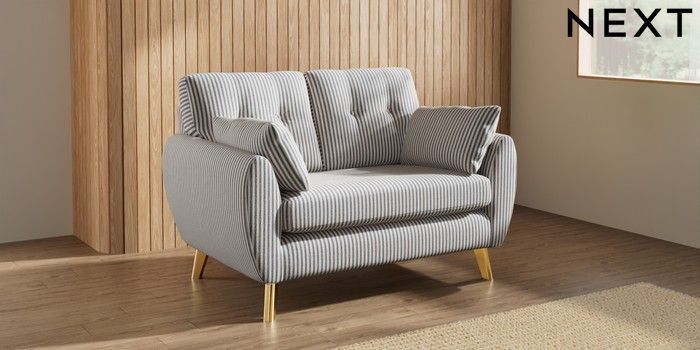 7.3.1 Buy Wilson Buttoned Back 2 Seater Small Sofa Chenille Stripe Slate Blue Metal Tapered - Gold from the Seasons online shop Click here to use our website with more accessibility support, for example screen readers